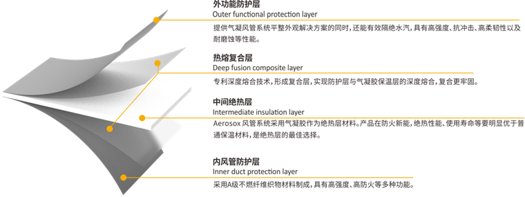 柔性⽓凝胶⻛管内防护层和外防护层 由超细硅纤维制作⽽成,实现A级不燃防⽕性能;中间⽓凝胶保温层天然具备⽆机材料的不燃性,可达到国标GB8624 A级不燃标准。